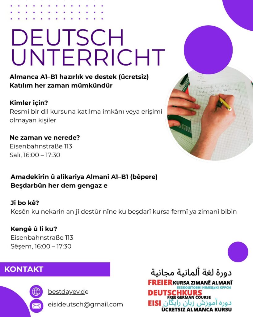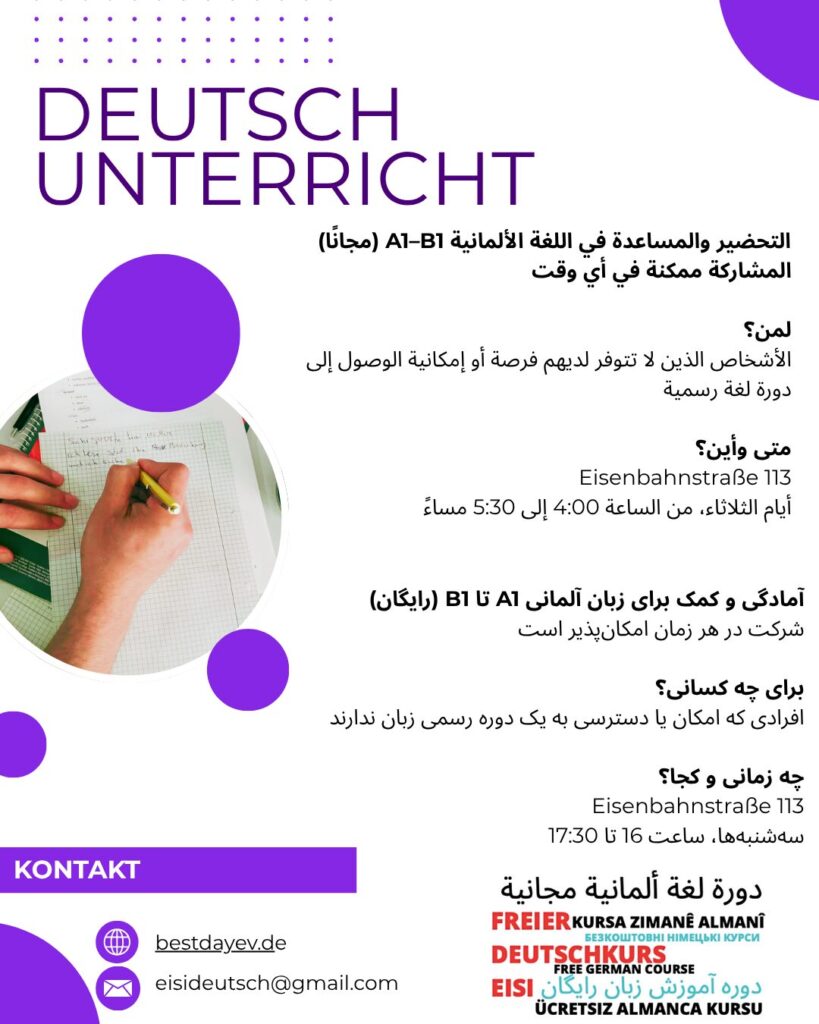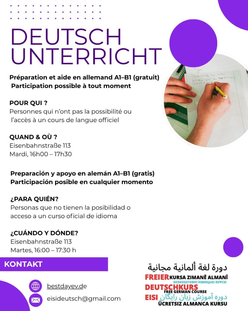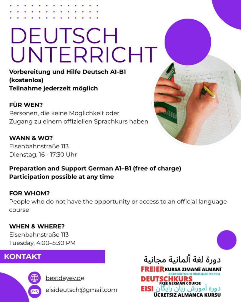 Der Best Day e.V. ist seit seiner Gründung 2017 im Leipziger Osten aktiv. Anspruch des Vereins ist es, möglichst niedrigschwellig den Zugang zu gesellschaftlicher und sozialer Teilhabe sowie politischer Mitsprache über kulturelle und bildungspolitische Angebote zu ermöglichen. Der Leipziger Osten ist stark migrantisch geprägt. Viele hier lebende Personen haben jedoch keinen Zugang zu Sprachkursen, weshalb das kostenlose und ehrenamtlich betriebene Projekt Eisideutsch entstanden ist. Hier können alle Personen teilnehmen, die zusätzlich zu ihrem offiziellen Unterricht Deutsch lernen möchten, aber auch diejenigen, die aus unterschiedlichen Gründen nicht an offiziellen Kursen teilnehmen können/dürfen. Wir möchten langfristig den Zugang zur sozialen und kulturellen Mitsprache fördern. Sprache ist für viele Migrant*innen grundlegend für ihre Zukunft und hängt beispielsweise mit ihrem Aufenthaltsstatus, dem Zugang zum Arbeitsmarkt, zur Ausbildung, aber auch ihrer gesellschaftlichen Position zusammen.